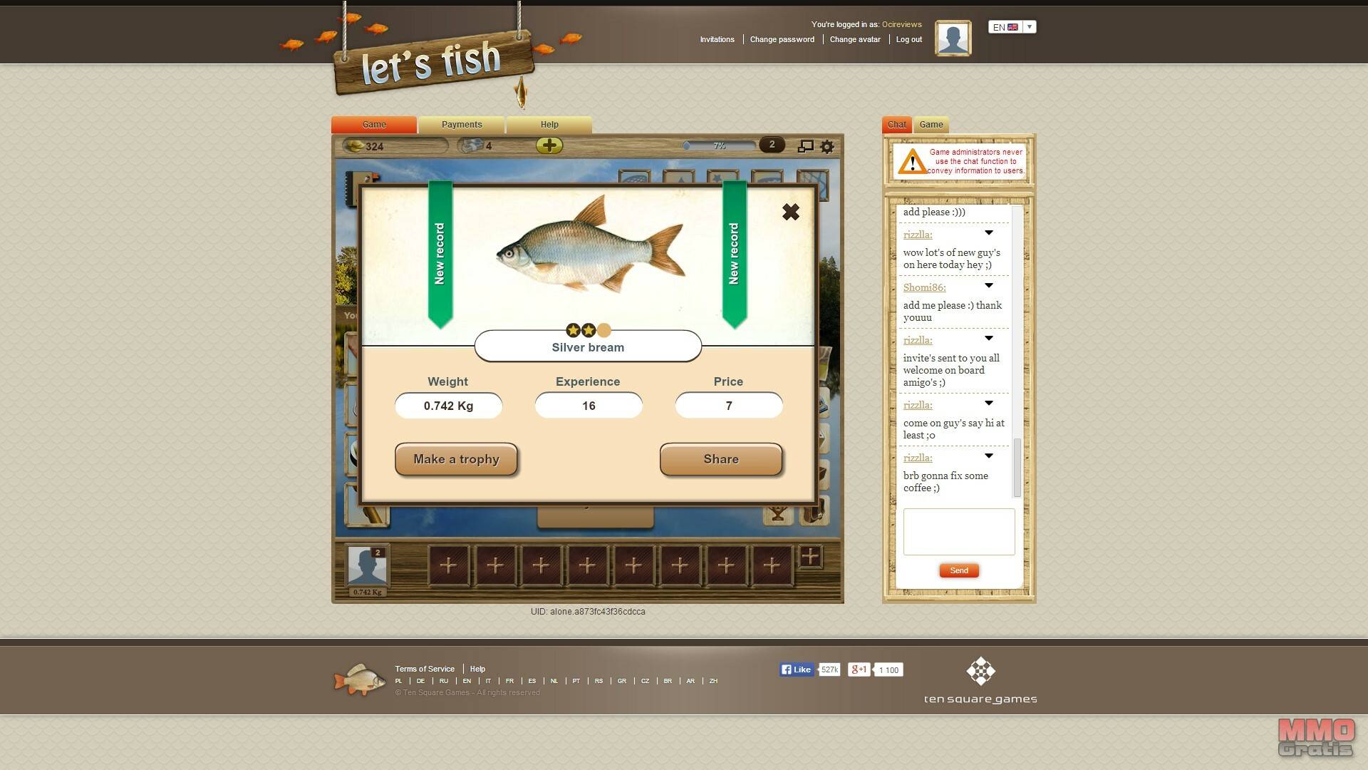 Tras registrarte en la web, entramos al juego, y fuimos bienvenidos por “Mike”, el PNJ encargado de guiarte por el inicio del juego. Al empezar aprenderás las mecánicas básicas, como que caña escoger, que hilo y que cebo usar para capturar peces de diferentes tamaños; un aspecto básico del juego es hacer que las piezas de equipo de complementen. Empezamos nuestras andanzas con una caña sencilla, algo de hilo de pesca, y pan que podíamos usar a modo de cebo, para capturar pequeños peces en un pequeño lago.