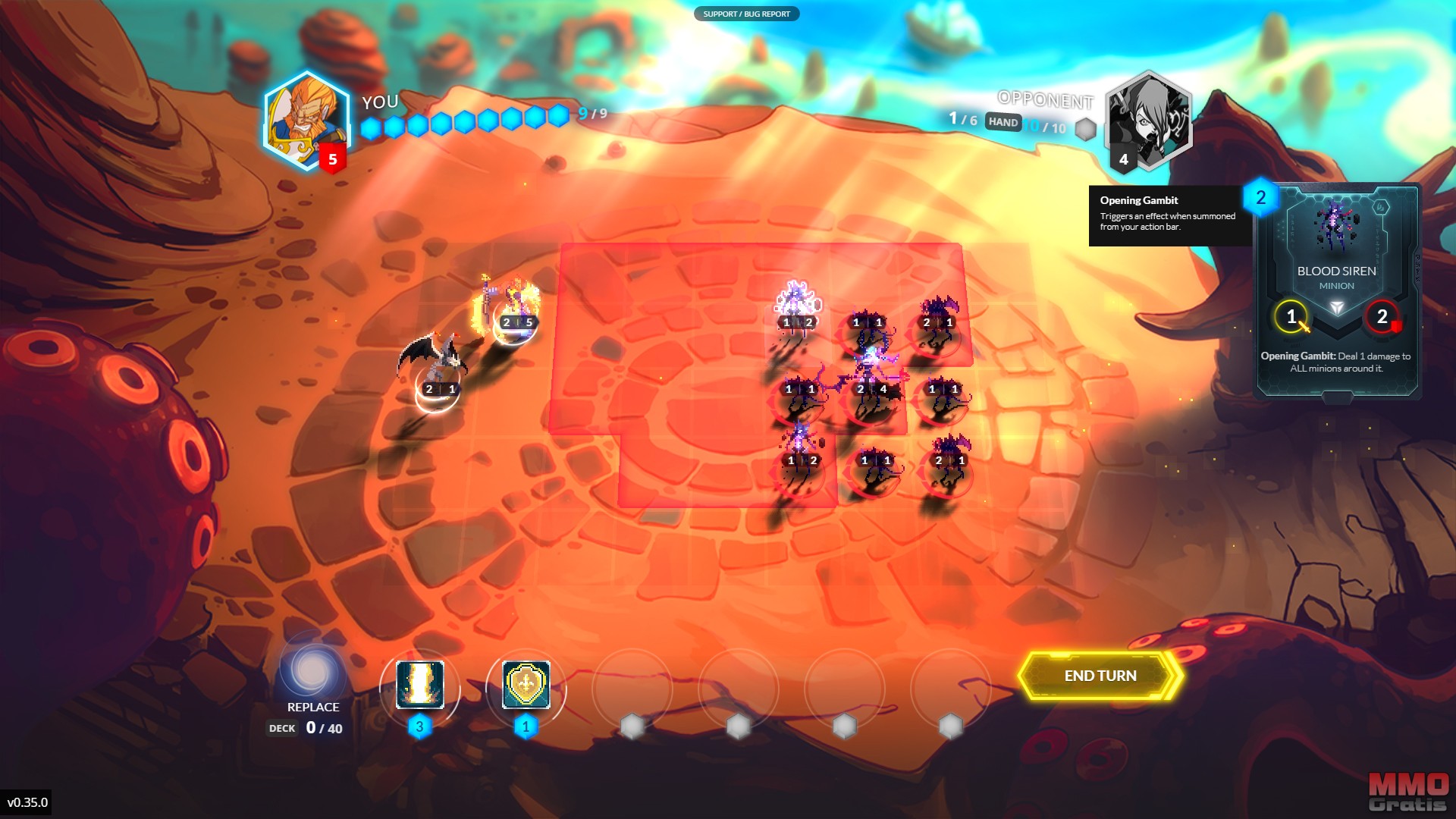 El campo de batalla es una cuadricula de 9x9, en la que cada jugador controla a su propio general, que está representado en el campo de batalla con su propia figura, básicamente si fuese una partida de ajedrez sería el Rey, aunque este reparte de lo lindo. Cada general tiene 25 puntos de salud (al menos los generales iniciales), y si consigues derrotar al General rival ganas la partida. Para poder hacerlo, los jugadores tienen que usar hechizos, artefactos y más importante, esbirros. Cada esbirro que coloquemos en el campo de batalla posee sus propios atributos de salud, ataque y movimiento, además de poder contar con habilidades especiales. Estas habilidades les permiten atacar dos veces cada turno, ir a cualquier espacio del campo de batalla o volverse más poderosos si están al lado de su general. Tienes que mover estratégicamente a tus esbirros por el campo de batalla aprovechando sus habilidades para superar a tu rival. Los hechizos se juegan directamente desde tu mano, y se usan para conseguir una gran variedad de efectos, como dañar o debilitar a los esbirros o al general enemigo, o fortalecer a tus propios esbirros. Los artefactos se equipan directamente en tu General, y le proporcionan distintas habilidades que lo volverán más poderoso y resistente.