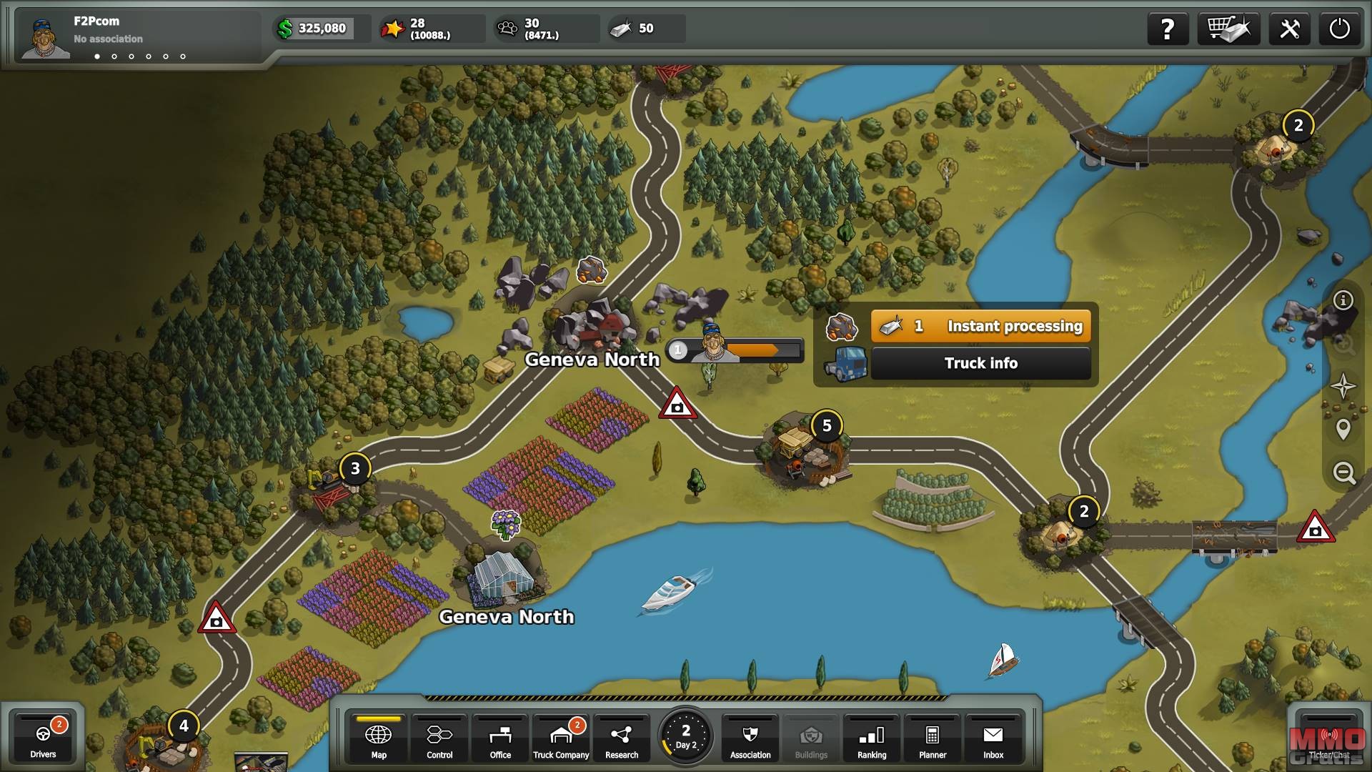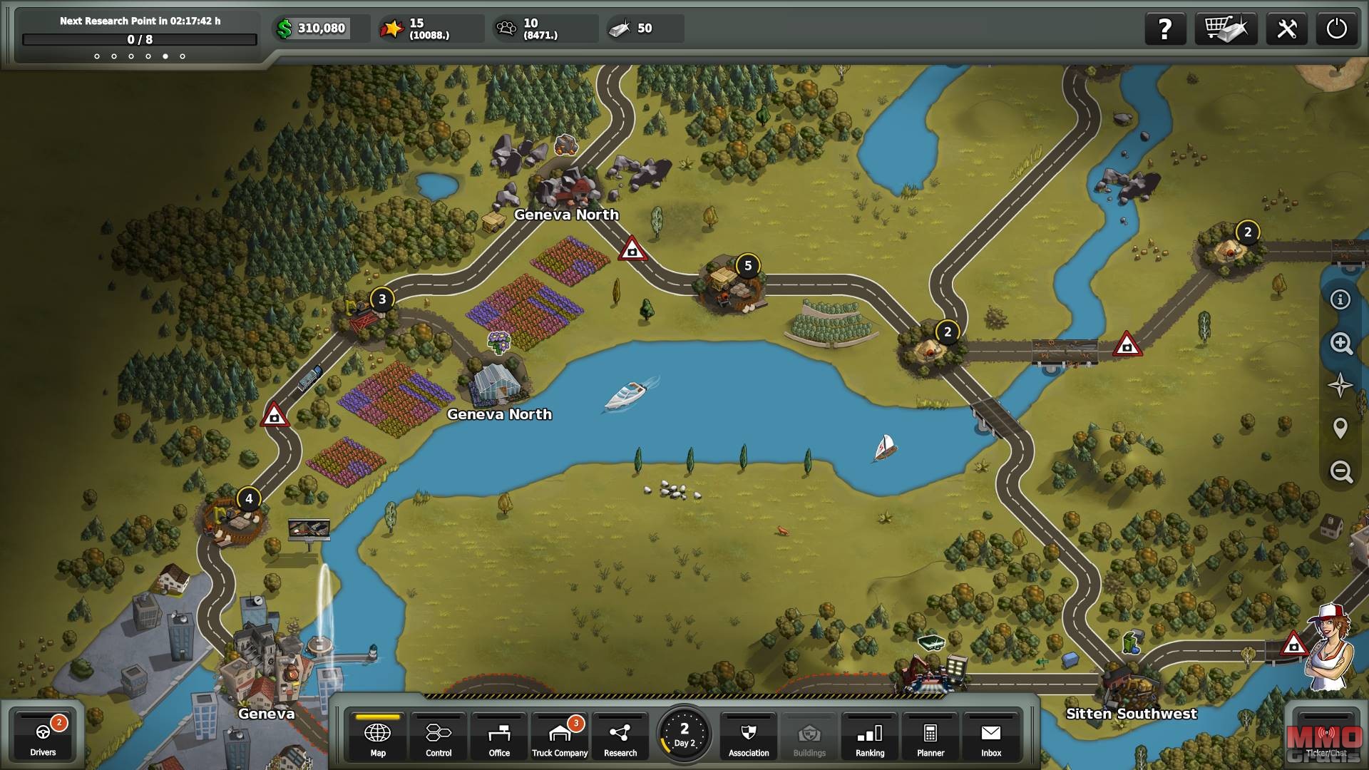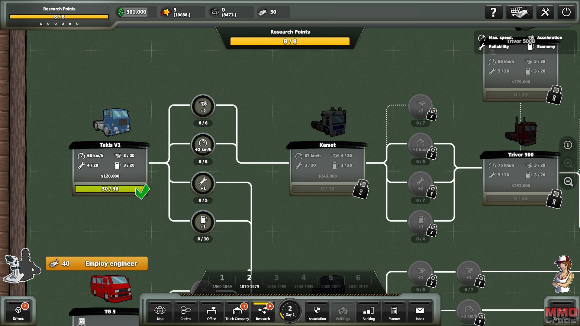 Dos de las principales características del juego nos decepcionaron bastante: el árbol de mejoras y el depósito de camiones. El depósito es un pedazo de territorio donde puedes construir varios edificios que proporcionan varios recursos, y que puedes mejorar para que proporcionen más recursos; lo malo es que no tiene nada interesante y es bastante aburrido. El árbol tecnológico es extremadamente lineal, y al invertir puntos de investigación podemos desbloquear camiones y mejoras para camiones, pero casi no hay elección sobre que camiones desbloquear, ya que el camino es recto.