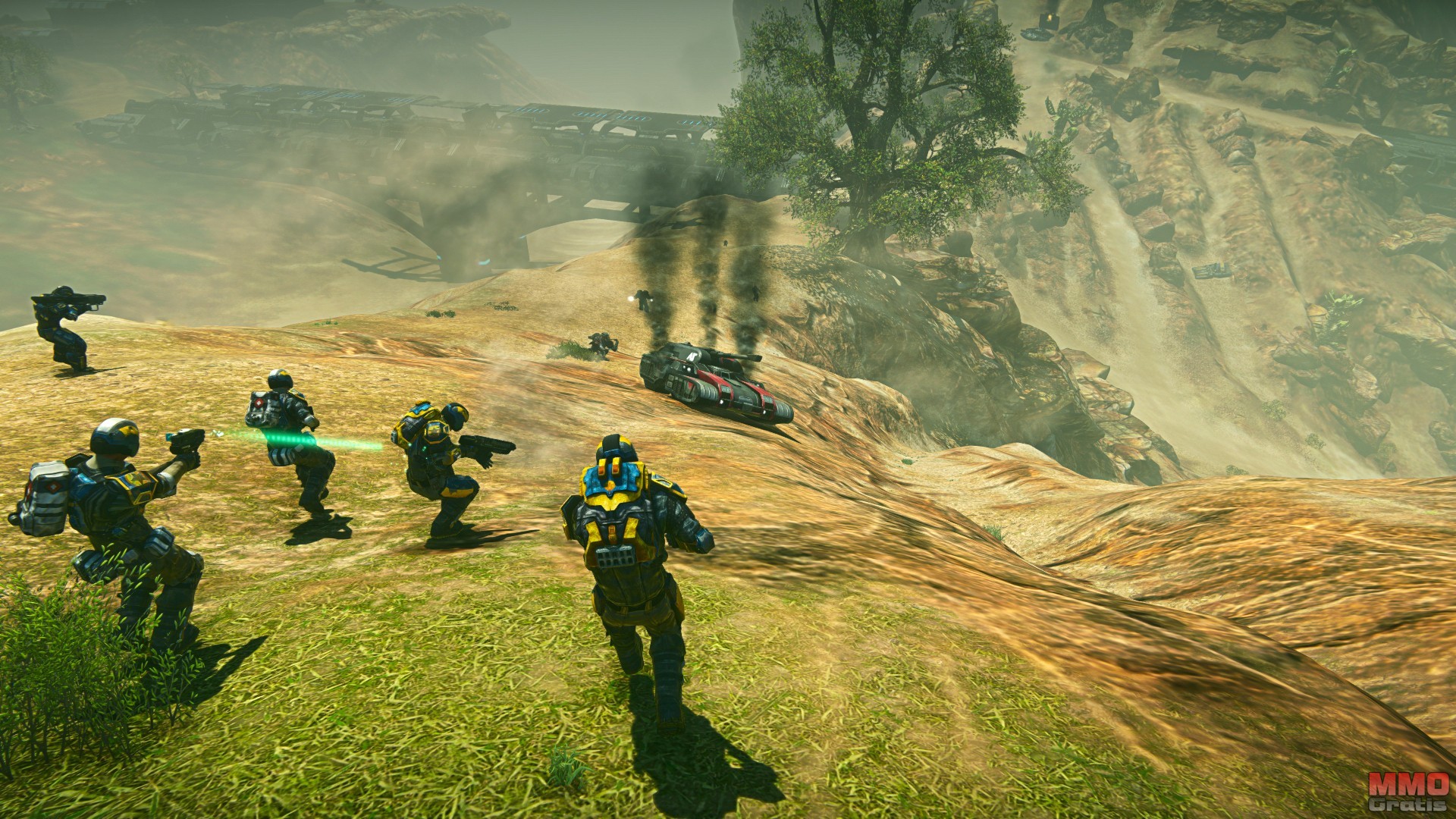- Sub-Objetivos - El juego se vuelve un poco tedioso ya que las mecánicas de captura de bases son siempre las mismas. En otras palabras, le faltan mas opciones. Cuando ya has capturado unas cuantas bases para tu facción, a pesar de las batallas épicas en las que podemos combatir, el juego puede resultar repetitivo. Sería interesante que los escuadrones tengan submisiones, lo que permitiría a grupos de dos o mas jugadores pudiesen contribuir a las batallas, en lugar de ser unos combatientes mas en conflictos a gran escala. Estas misiones estarían centradas en asaltar pequeños puestos como minas de recursos, que pueden proporcionar recursos a sus facciones, o hacer que los escudos de las bases enemigas caigan temporalmente. ¿Y por que no misiones opuestas? por ejemplo que una facción tenga que llevar un convoy de recursos a un portal, mientras que la facción rival tiene que evitar que ese convoy llegue o que tengan que conquistar ese mismo portal. También sería interesante que hubiese mecánicas que pusieran recompensas sobre las cabezas de aquellos jugadores que consigan hacer hazañas, o que nos hiciesen llevar módulos de una base a otra para cumplir objetivos, al mas puro estilo de captura la bandera; nos encantaría ver algo así en el juego, y creemos que le daría mucha vidilla a las batallas.