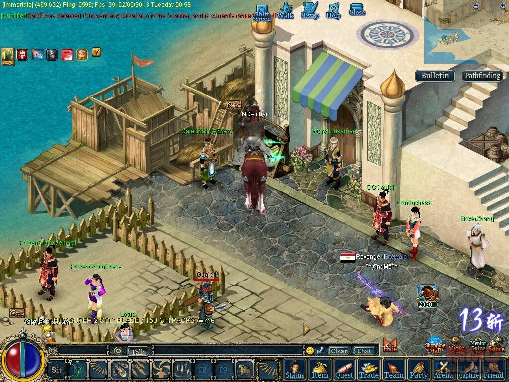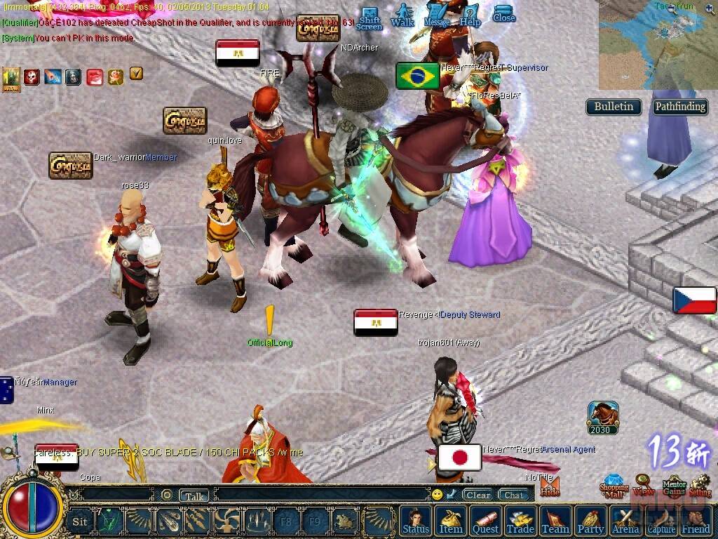 Conquer Online tiene un montón de clases para elegir: Warrior, Ninja, Trojan, Archer, Monk, Taoist, Pirate y el nuevo Oriental Assassin. Cómo podeis ver, con alguna excepción cómo el Warrior y el Archer, las clases son muy originales, y diferentes a los que estamos acostumbrados en los MMORPG de fantasía habituales. Lo negativo, una carencia casi total de personalización. EL juego te deja elegir el sexo y el tamaño del cuerpo, pero eso es todo. No puedes elegir cara, peinados, ni nada mas. Mas tarde descubrimos a un NPC que te puede cambiar el peinado a cambio de dinero.