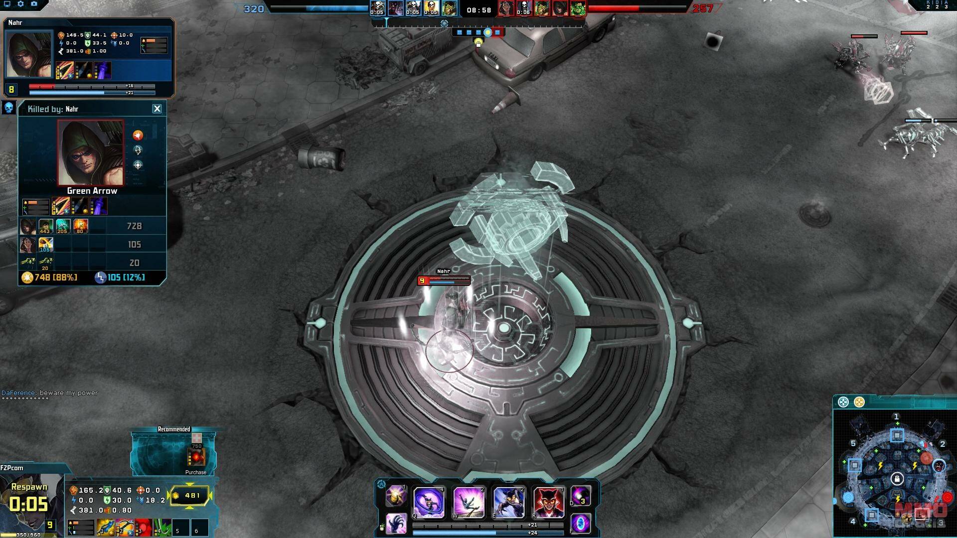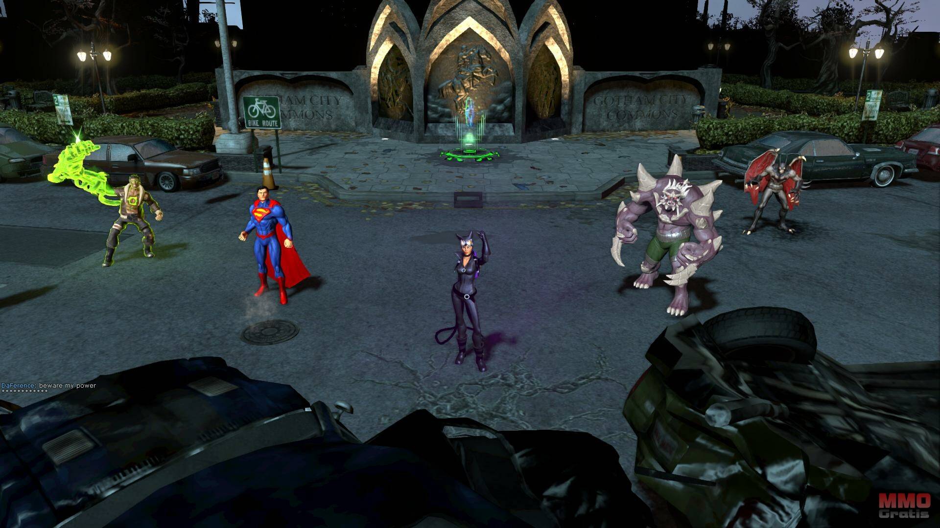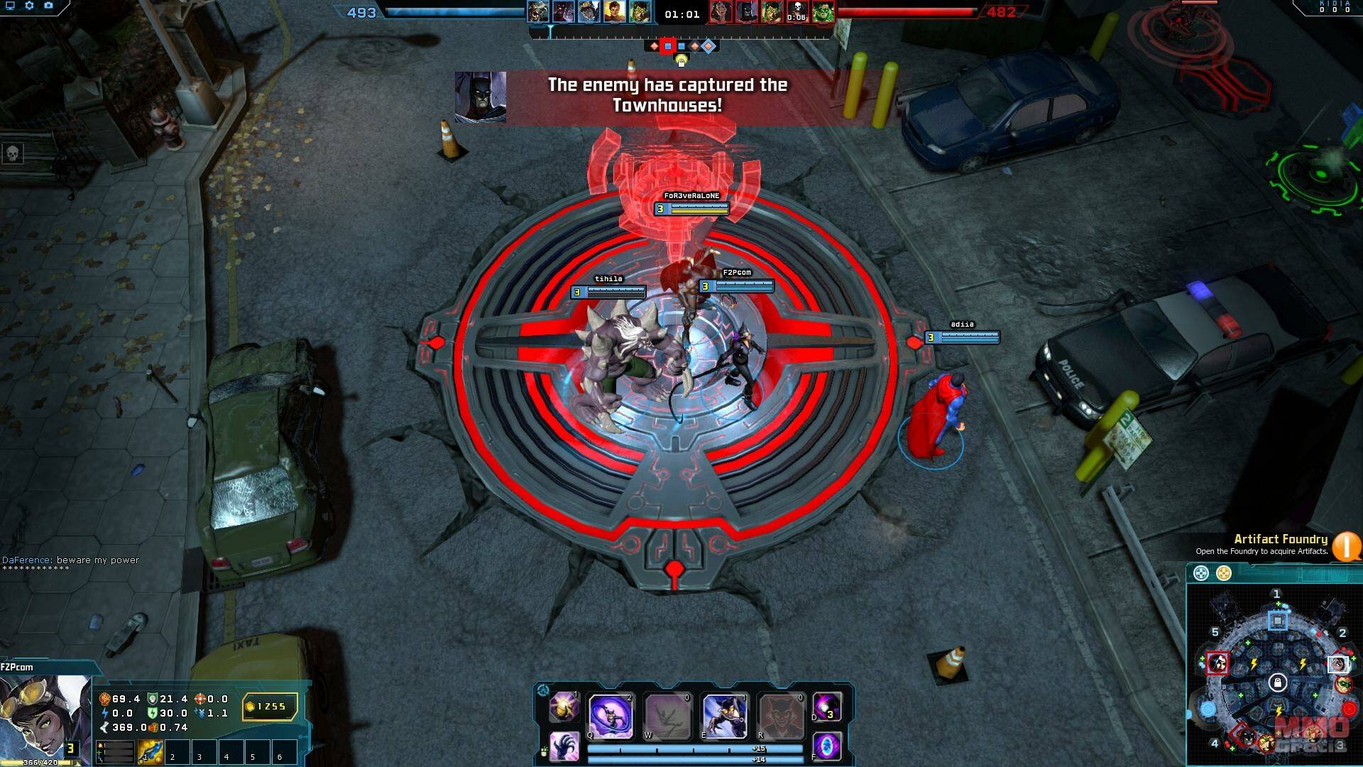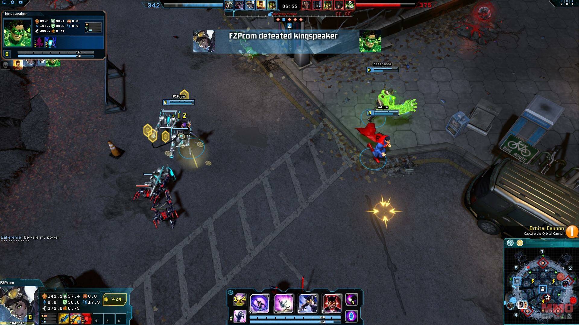 En el juego hemos probado el mapa “Gotham Heights”, donde el objetivos es capturar los puntos de control para conseguir puntuación. Por el mapa van apareciendo packs de salud y potenciadores de velocidad, pero la característica más destacable es que en centro del mapa hay un cañón orbital. Los jugadores pueden controlar este cañón orbital para invocar drones de asalto, lanzar meteoritos en la zona de “jungla” cercana a la base enemiga, lo que reducirá su acceso a los recursos del mapa. El controlar el cañón orbital puede girar las tornas de la batalla, por lo que hacerse con él, es tan importante como controlar los diferentes puntos de control repartidos por el mapa.