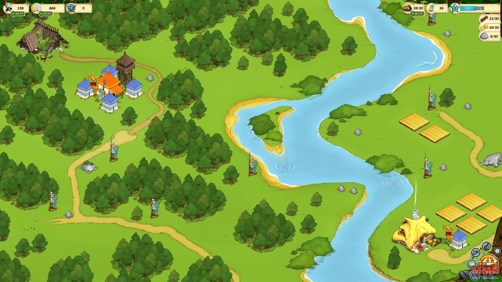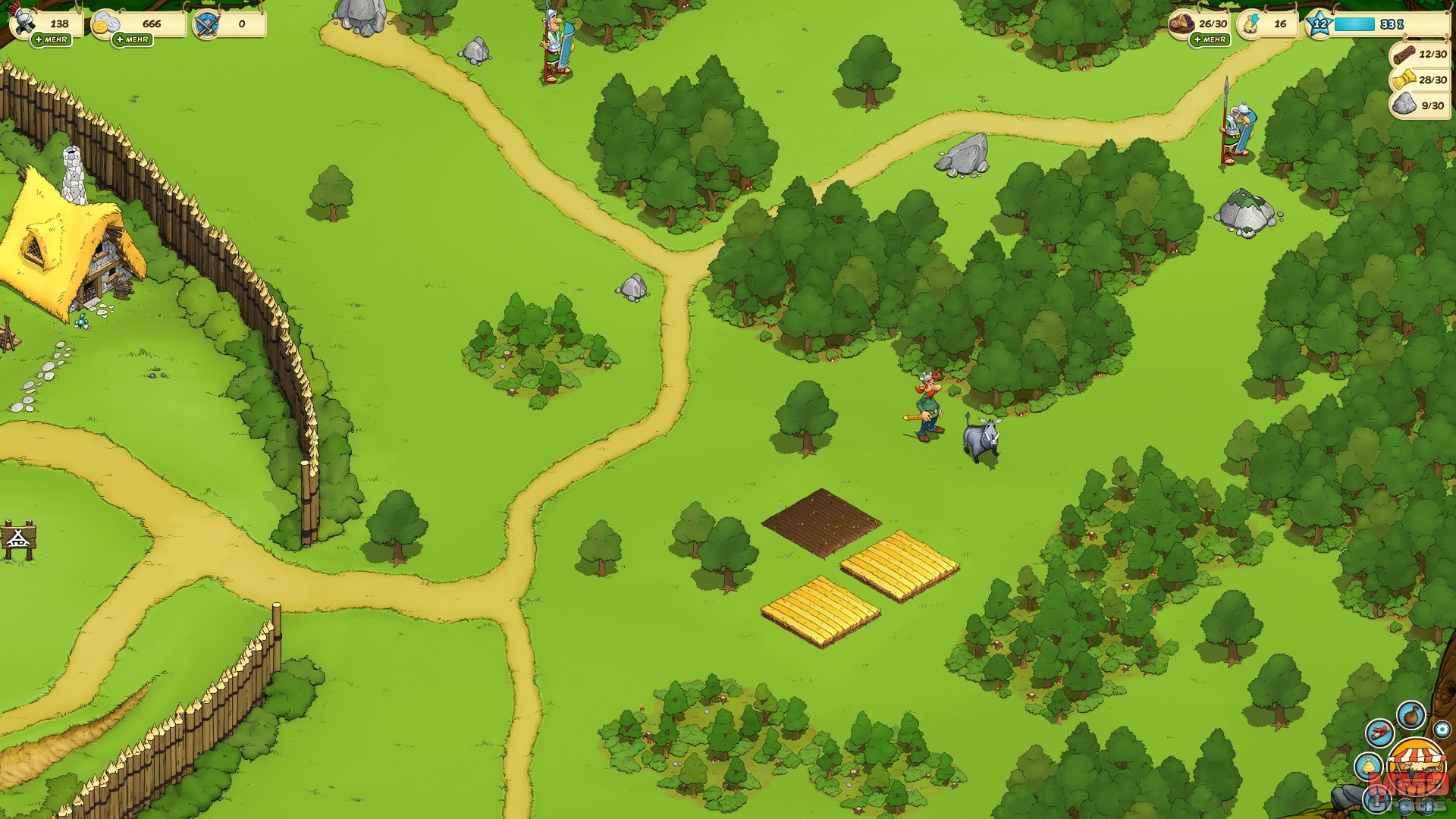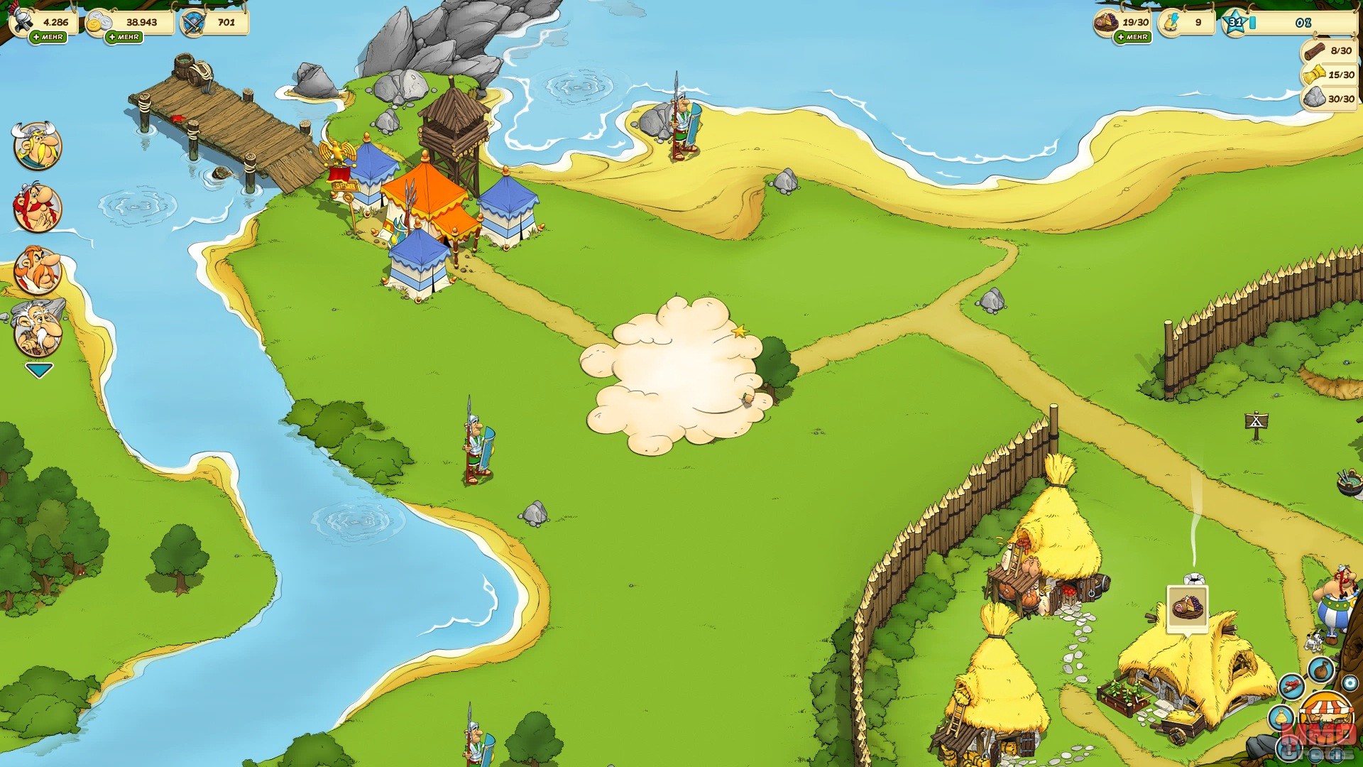 Pues la oportunidad de crear el juego nació cuando un editor con una la licencia para poder desarrollar un juego basado en el universo de Asterix se acercó a nosotros, lo cual fue una oportunidad enorme, ya que Asterix es mundialmente conocido, y nos permitía crear un título fácilmente reconocido y con muchos fans. La historia del juego es que los romanos han arrasado con tu aldea (no es la misma que la de Asterix) y que junto a la ayuda de Asterix y Obelix tendrás que reconstruirla y expulsar a los invasores romanos.