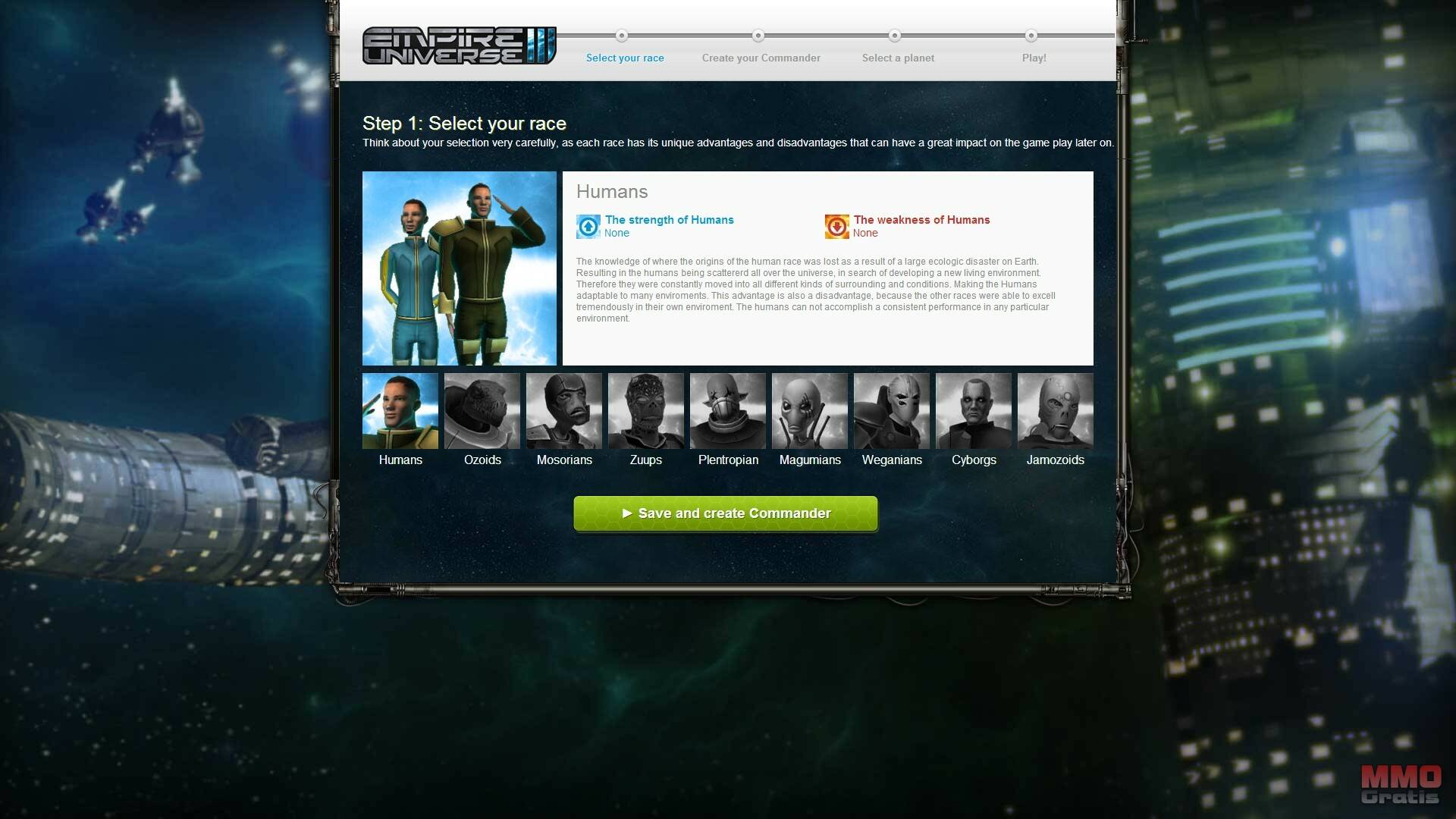 Entrar al juego es sencillo y rápido, tan solo tienes que registrar una cuenta, y cuando la tienes ya eres libre de adentrarte en el mundo de Empire Universe, además al crear tu cuenta el juego te mostrará algunos links de interés que te llevarán a los foros del juego, además de a una página de información del juego y de su funcionamiento. Una vez dentro del juego tienes que escoger una de las 9 razas disponibles, desde los típicos humanos a razas alienígenas de lo más únicas. Cada raza tiene unas virtudes y unos defectos propios, que afectan a las características básicas del juego, como la investigación, el comercio, o sus habilidades de combate. Nosotros escogimos a los Magumians, unos pequeños alienígenas de color gris y ojos enormes. Tras escoger tu raza tienes que escoger a tu comandante entre varios personajes, ponerle un nombre, y por ultimo escoger tu planeta de inicio, cuyo único propósito es darle un aspecto más único, al que además podrás nombrar a tu gusto.
