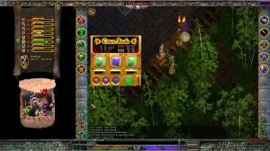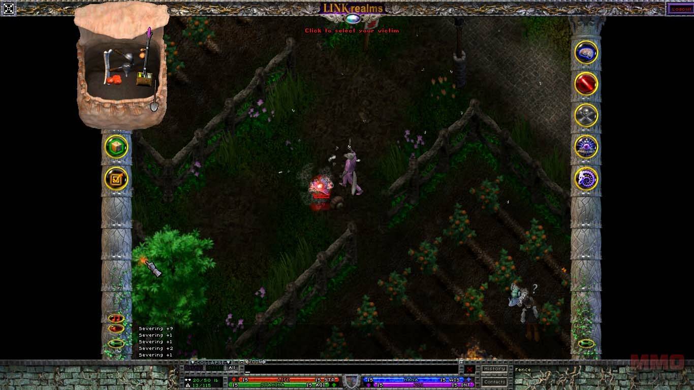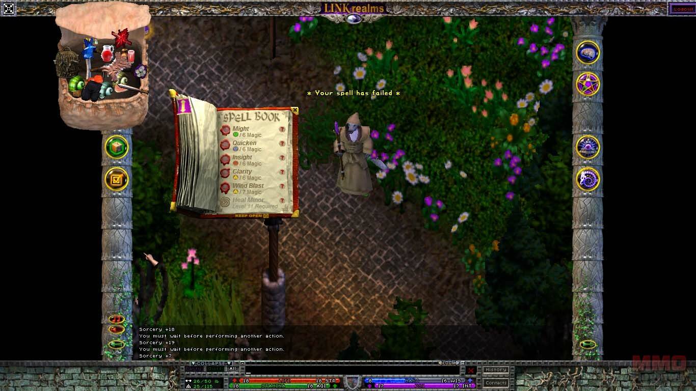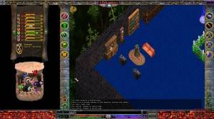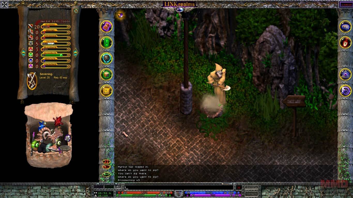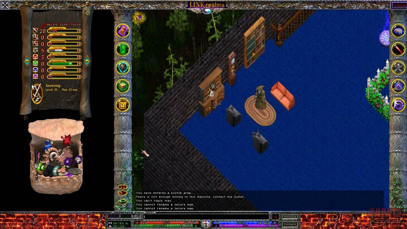 La interfaz es algo a lo que no estoy acostumbrado. Basicamente tienes la ventana de juego en el centro en la que controlas a tu personaje, y espacios vacios a la derecha y a la izquierda, donde podrás poner libremente tus bolsas, tus páginas de habilidades, en las esquinas tienes 2 columnas verticales con varios botones: inventario, misiones, mapa, editor de reinos, opciones, habilidades, tecnicas (que dependen de las armas que lleves equipadas), clarividencia(habilidades relacionadas con la magia) y espiritualismo. Tus bolsas no tienen espacios, y puedes mover tus objetos en ellas libremente, por ello ser ordenado será un requisito. Las barras de vida, mana y psionica estan en la parte inferior de la pantalla.