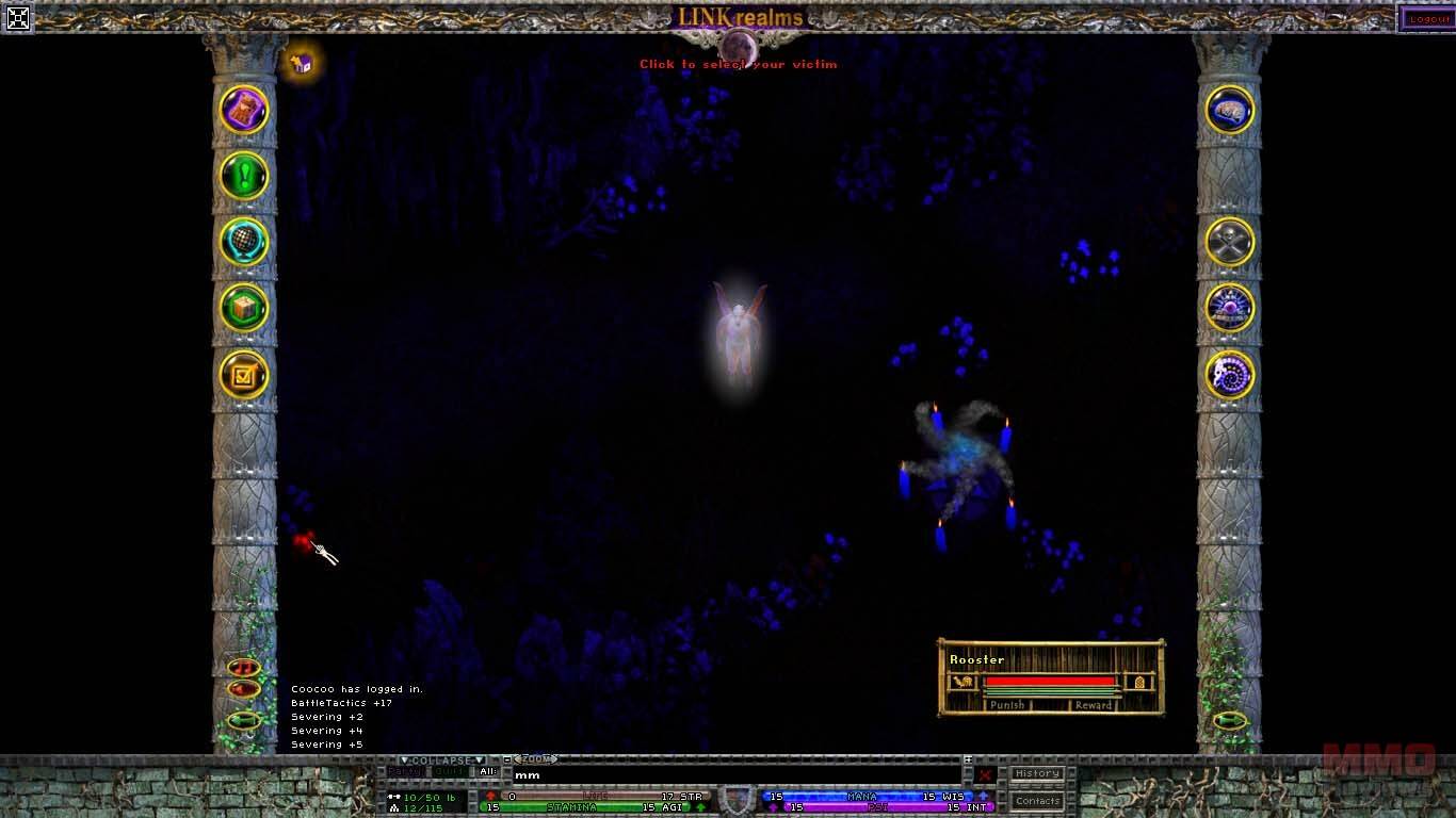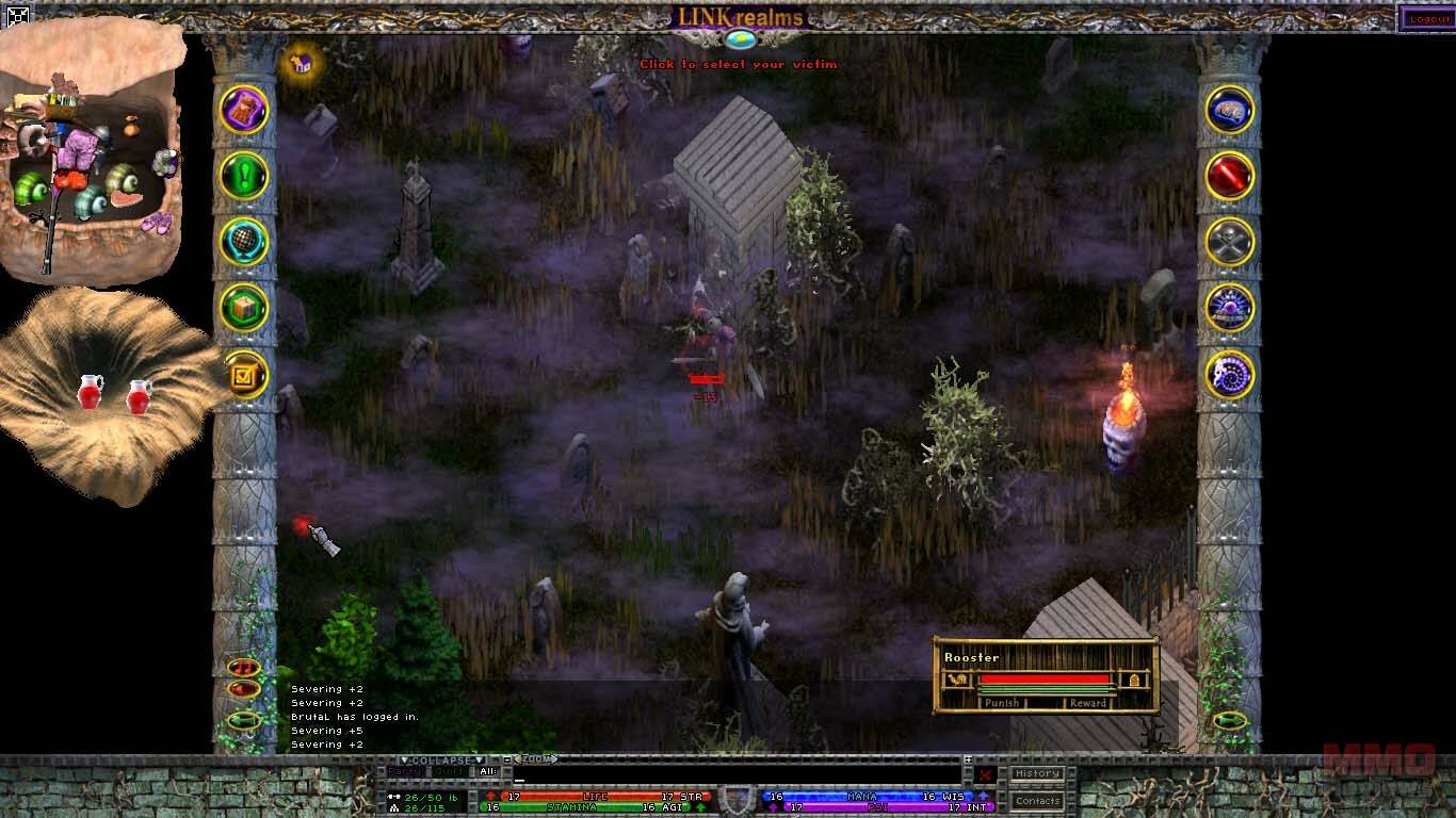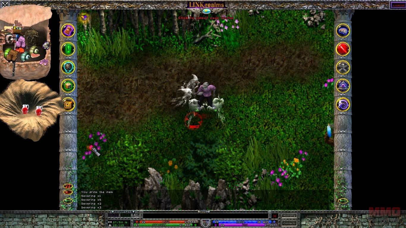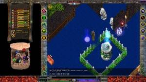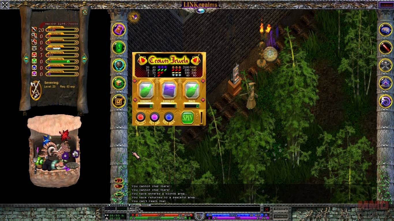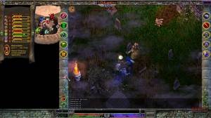 La interfaz es algo a lo que no estoy acostumbrado. Basicamente tienes la ventana de juego en el centro en la que controlas a tu personaje, y espacios vacios a la derecha y a la izquierda, donde podrás poner libremente tus bolsas, tus páginas de habilidades, en las esquinas tienes 2 columnas verticales con varios botones: inventario, misiones, mapa, editor de reinos, opciones, habilidades, tecnicas (que dependen de las armas que lleves equipadas), clarividencia(habilidades relacionadas con la magia) y espiritualismo. Tus bolsas no tienen espacios, y puedes mover tus objetos en ellas libremente, por ello ser ordenado será un requisito. Las barras de vida, mana y psionica estan en la parte inferior de la pantalla.