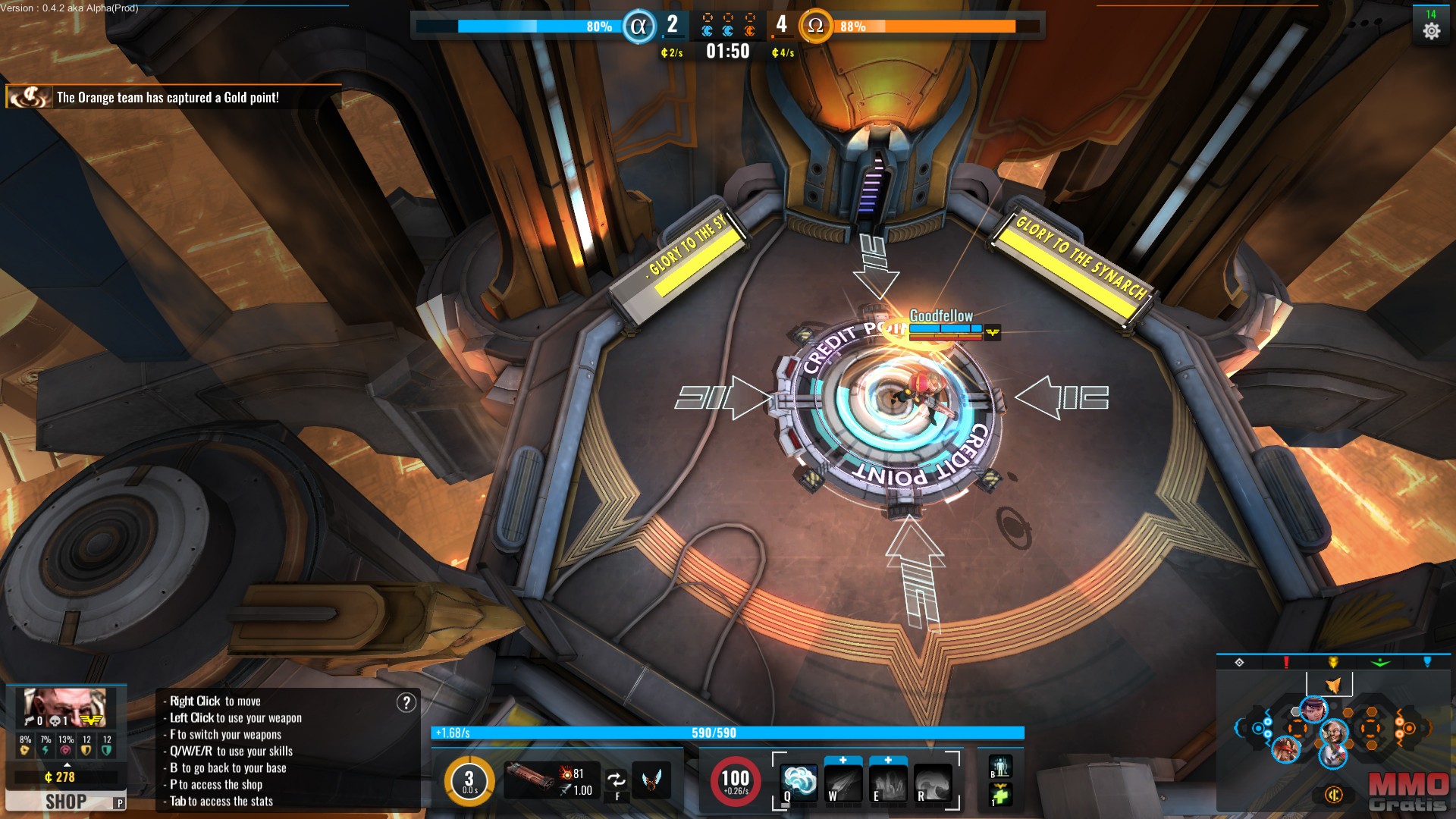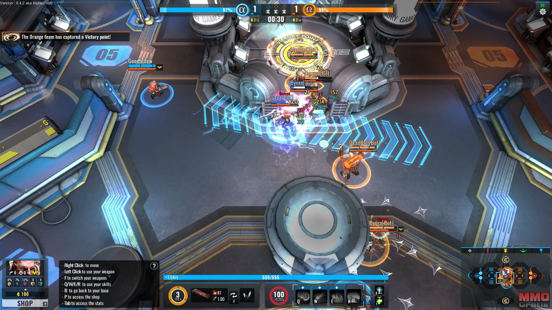 El juego cuenta con muchas de las características que podríamos ver en otros MOBAs similares, incluyendo el objetivo general (al menos en el mapa Arkashan) de destruir el núcleo energético del rival, el cual está protegido por dos torres defensivas y un campo de fuerza. Para desactivar el campo de fuerza los jugadores tendrán que hacerse con el control de tres puntos de captura repartidos por el mapa, tras lo cual tendrán un tiempo limitado para atacar el núcleo del equipo rival. Al igual que los objetivos, los controles son muy parecidos; en QWER tenemos las habilidades, aunque también cuenta con un sistema que nos permite movernos con WASD y apuntar con el ratón, lo cual nos permite correr y disparar en direcciones opuestas, aunque es bastante más complejo que el sistema de control estándar. En el juego también consigues experiencia con la que subes de nivel y mejoras y tus habilidades, y créditos que puedes usar para comprar armas; lo más interesante es que todos los personajes pueden luchar tanto cuerpo a cuerpo como a distancia, ya que podemos tener un arma a distancia y una cuerpo a cuerpo a la vez, aunque hay personajes que son más poderosos cuerpo a cuerpo.