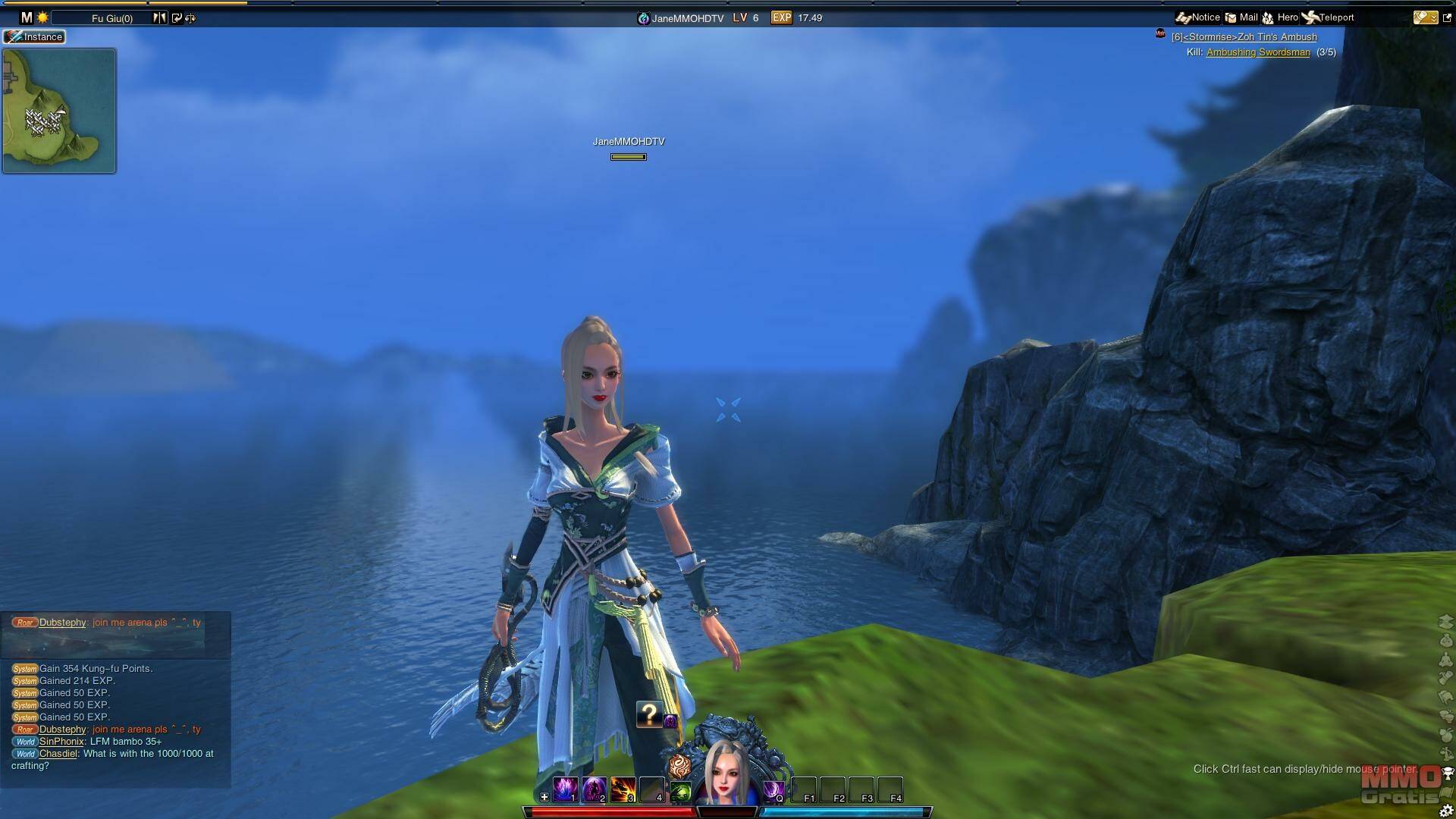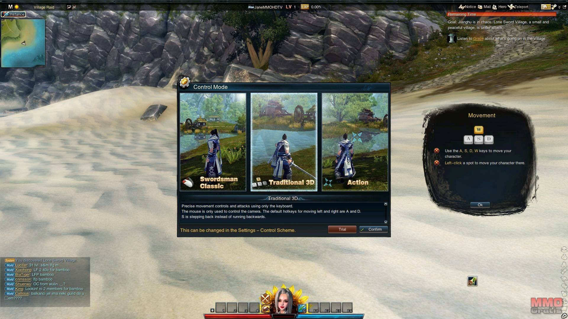 Creamos a una bella luchadora llamada Portman (evidentemente por la bella actriz de igual apellido) y entramos al juego. Tras ver la escena inicial, aparecimos en una playa, y nada más tomar control de nuestro personaje nos dimos cuenta de un interesante detalle: el sistema de control de nuestro personaje. Hay tres formas distintas de controlar a tu personaje cuando usas teclado y ratón: Swordsman Classic, Traditional 3D y Action, que te proporcionan tres formas distintas de jugar con tu personaje dependiendo de tus preferencias, lo que añade un toque muy interesante al título. Los jugadores no están obligados a usar solo uno de estos sistemas y pueden cambiar en cualquier momento para encontrar cual se ajusta mejor a su estilo de juego.