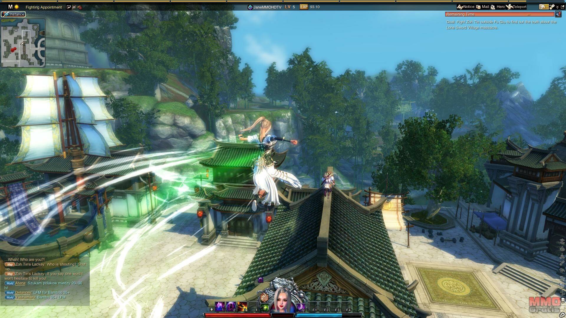 Tras esto nos despertamos en una ciudad, donde somos informados de que el tipo que lideró el ataque a nuestro poblado iba a asistir a una especie de reunión. Tras esto fuimos de PNJ a PNJ como pollos sin cabeza completando misiones que no despertaban demasiado interés, que ni de lejos se asemeja a la emoción de las primeras misiones de Neverwinter. Tras encararnos de nuevo al tipo que arrasó nuestro poblado, el resultado fue más o menos el mismo que en el enfrentamiento anterior que tuvimos con él, ya que apareció nuestro salvador de nuevo y nos sacó las castañas del fuego, informándonos de nuestra incapacidad (¿de verdad? No nos habíamos dado cuenta!) para derrotar a ese contrincante, y que primero tendríamos que entrenar y volvernos más poderosos. Nuestro entrenamiento fue básicamente ir a un PNJ y escoger la escuela de artes marciales a la que nos queríamos unir; al hacerlo aprendimos instantáneamente tres habilidades nuevas y voilá, ya estábamos listos para derrotar al hace unos momentos, enemigo imposible de vencer. Tras desafiarlo abiertamente en la plaza de la ciudad (se nota que la sutileza en uno de los puntos fuertes de nuestro personaje) empezó una escena en la que le perseguíamos por los tejados, hasta llegar a un bosque y a otra localización donde nos enfrentamos a otro tipo que no resulto ser demasiado desafiante, al que también eliminó (otra vez) un PNJ que apareció para echarnos un cable.