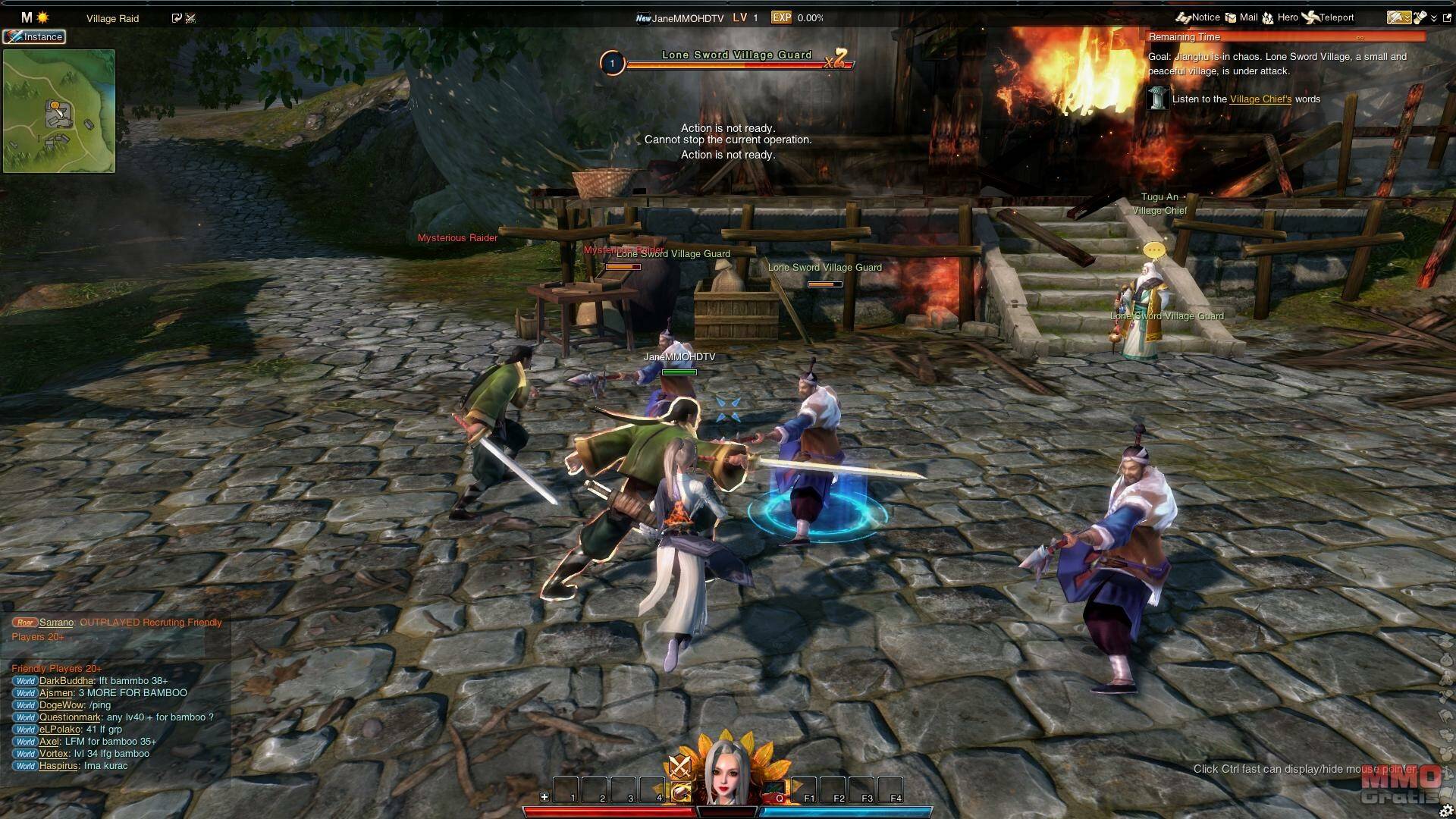 El combate era un poco mediocre, aunque esto puede debido a que estábamos los niveles iniciales, por lo que es difícil decir cómo será a niveles altos, tanto en PvP como en PvE, pero nuestra impresión es que era un poco lento y torpe. Tras abrirnos paso por varios invasores, nos encontramos con un tipo muy duro y malvado que no nos dejó otra opción que huir (todo esto es una escena dentro del juego) del poblado armados con una espada que nos dio el anciano de la aldea. Cuando estábamos a punto de ser convertidos en picadillo por el tipo duro y malvado apareció un héroe errante que se enfrentó a los que amenazaban nuestra vida y nos rescató.
