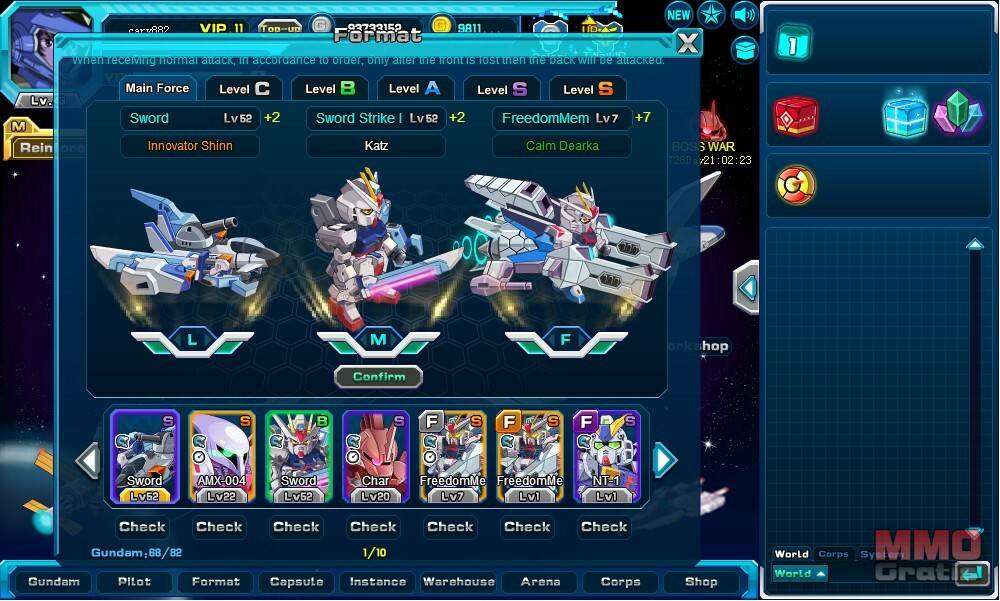 Cada Gundam está acompañado de un piloto, y cada piloto y Gundam tienen 5 calidades distintas: Blanco (C), Verde (B), Azul (A), Purpura (S) y Naranja (SS), que determinará el poder de batalla de cada combatiente, que será la mezcla del poder de batalla del piloto y del Gundam. Los Gundam podrán ser mejorados en la Cámara Evolutiva, mientras que los pilotos mejorarán sus habilidades en el centro de administración de los oficiales.